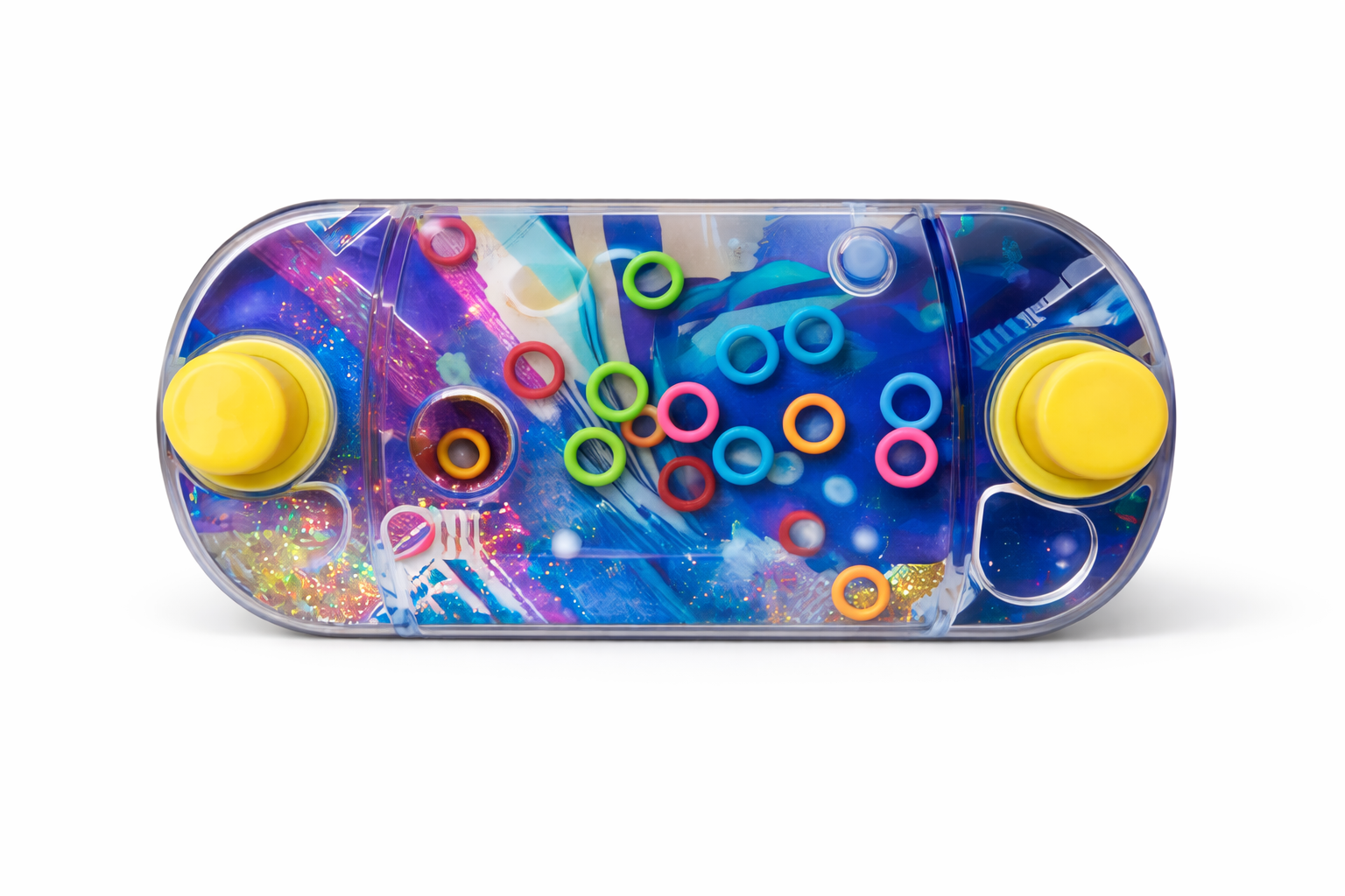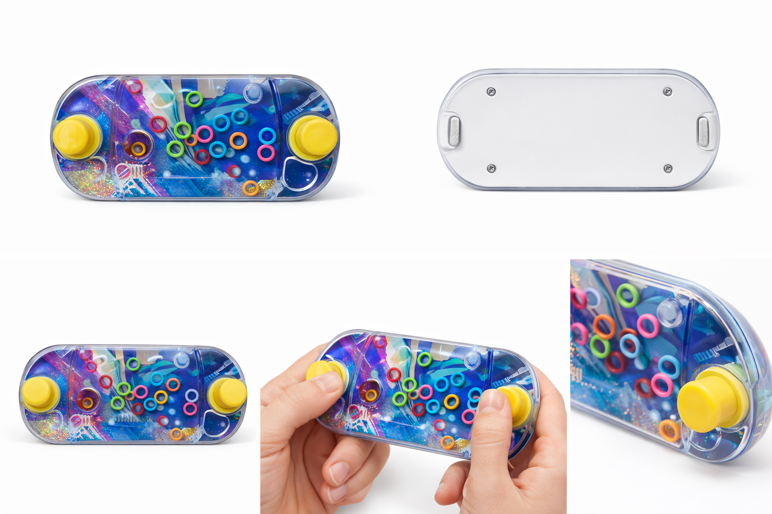 The Water Ring Toss Game is a classic handheld toy that provides endless fun and entertainment for kids and adults alike. This exciting water-based game challenges players to press the buttons and guide the colorful rings onto the small pegs inside the water-filled chamber.